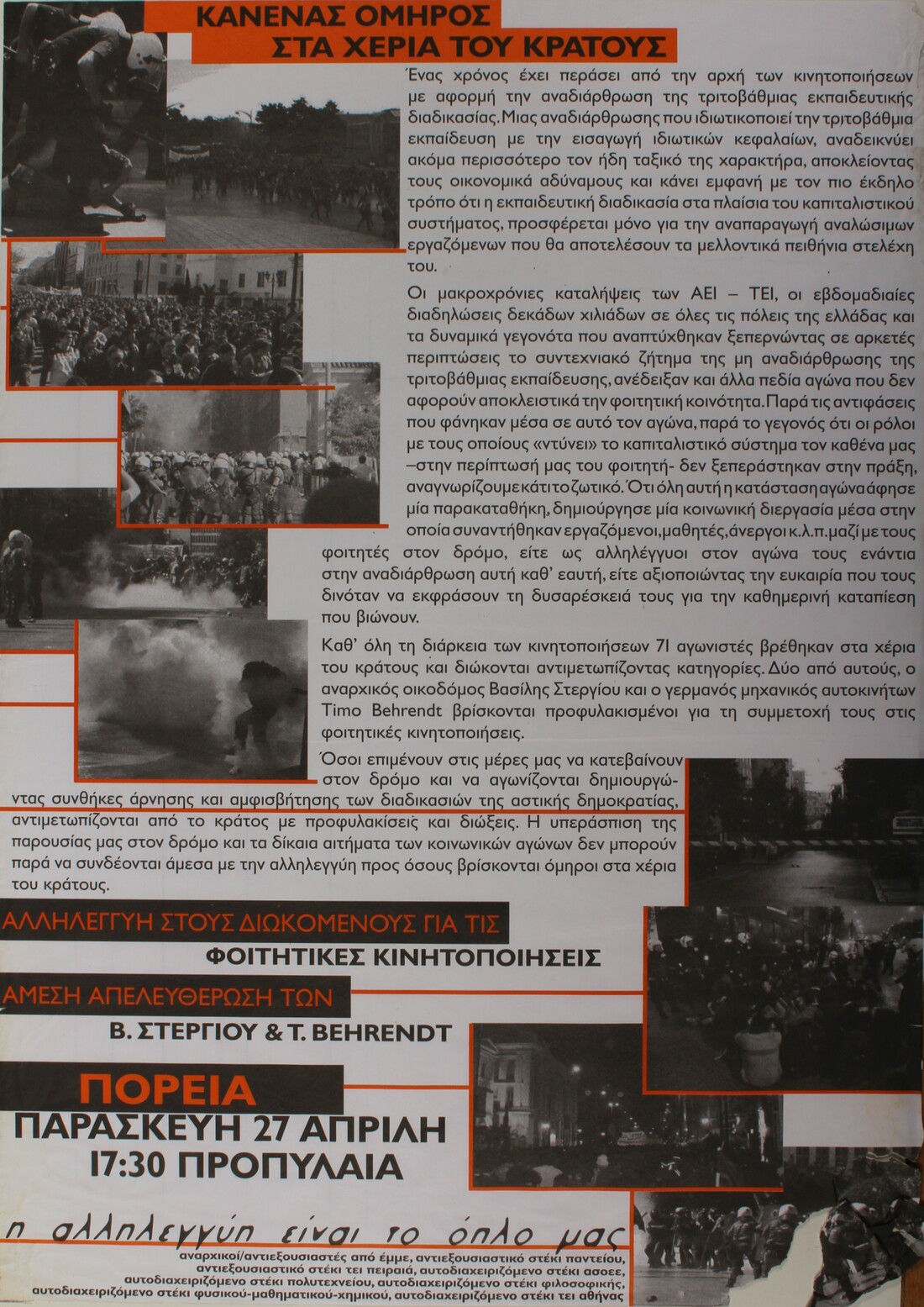 Κανένας όμηρος στα χέρια του κράτους: Αλληλεγγύη στους διωκόμενους για τις φοιτητικές κινητοποίησεις, άμεση απελευθέρωση των Β.Στεργίου και T.Behrendt