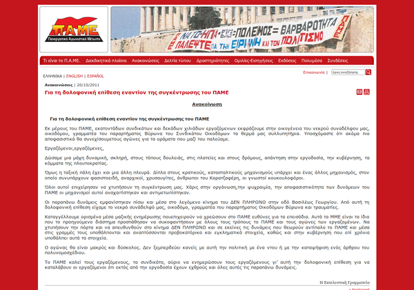 Για τη δολοφονική επίθεση εναντίον της συγκέντρωσης του ΠΑΜΕ