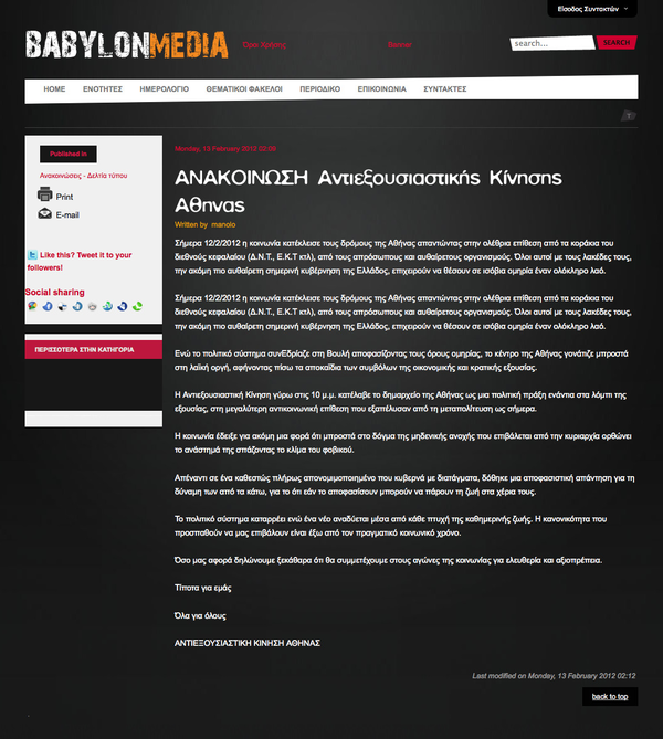 Ανακοίνωση Αντιεξουσιαστικής κίνησης Αθήνας